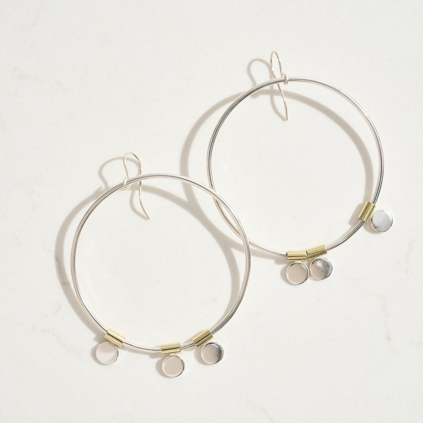 The design features silver hoops with three silver circle charms suspended from sleek gold tubing. Circles, long revered as symbols of the feminine in ancient civilizations, are associated with the full moon, a representation of wholeness, continuity, and life’s cyclical nature.