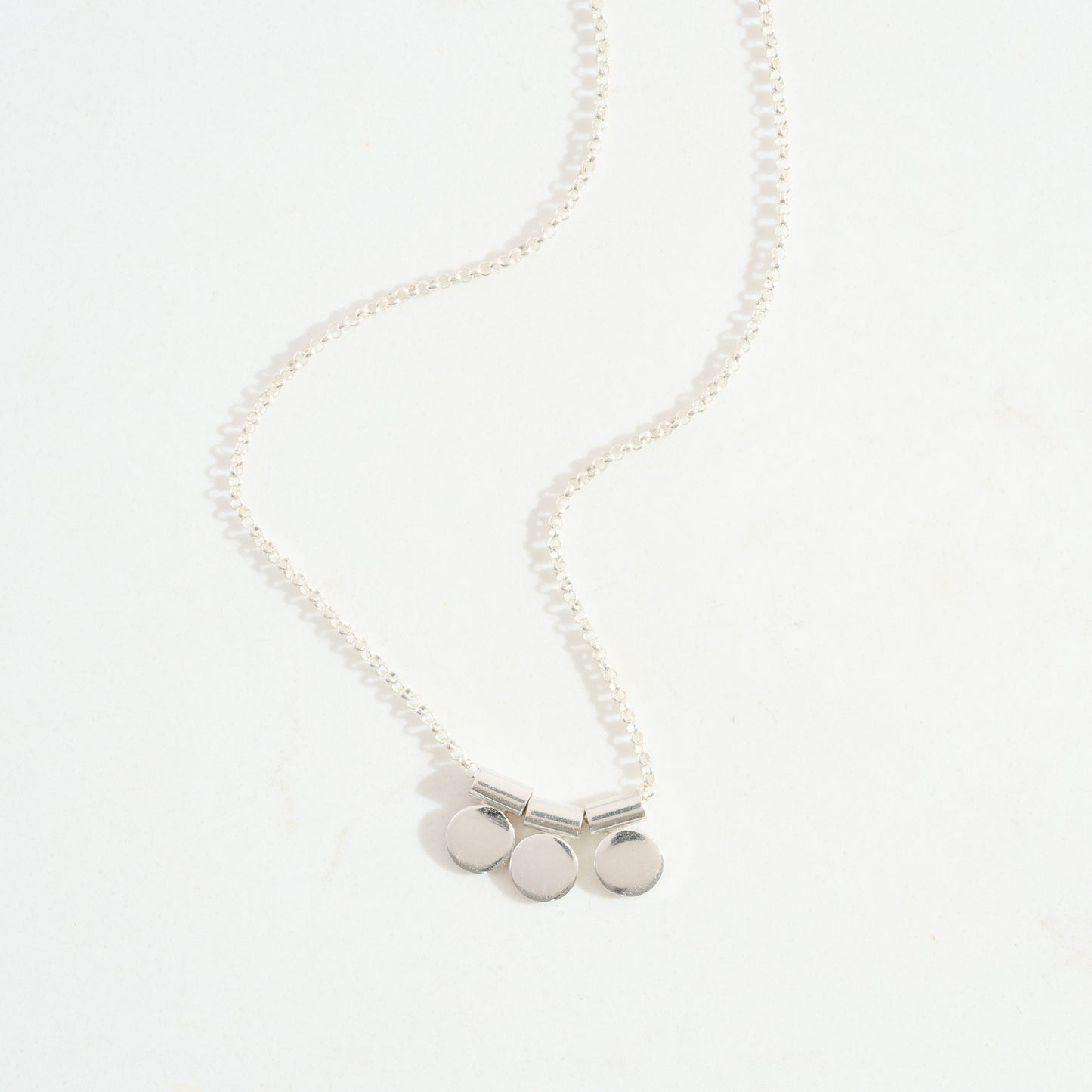 The design features three silver circle charms suspended from sleek gold tubing. Circles have long been revered in ancient civilizations as symbols of the feminine due to their association with the full moon. The full moon represents wholeness, continuity, and the cyclical nature of life.