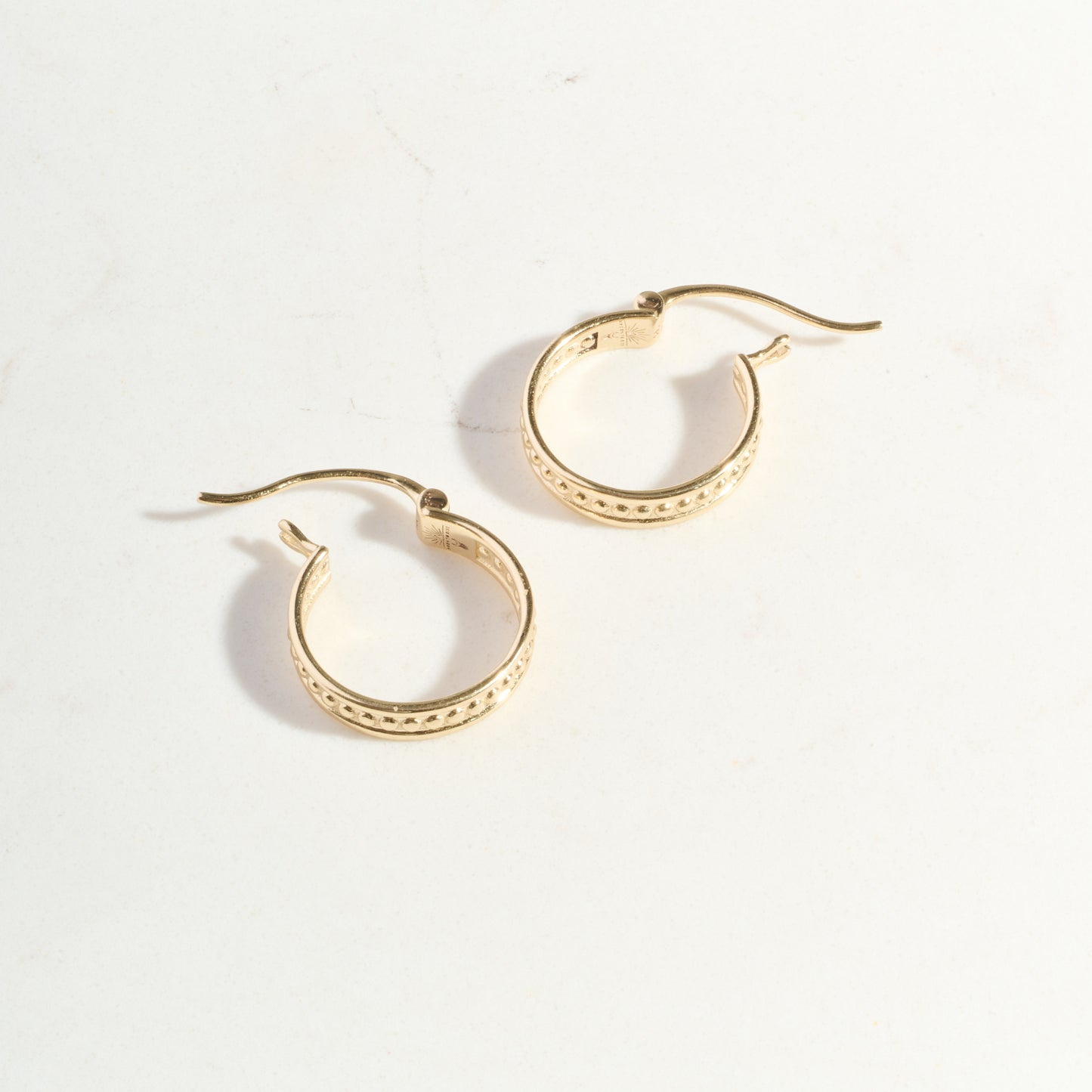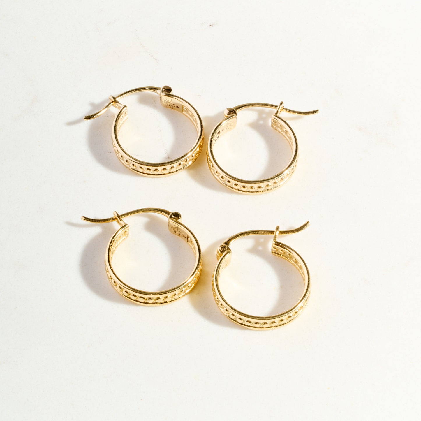 With a unique dotted texture reminiscent of the decorative elements found in ancient Etruscan armor, these hoops are crafted to shield your energy and well-being, turning the essence of protection into an everyday adornment.